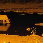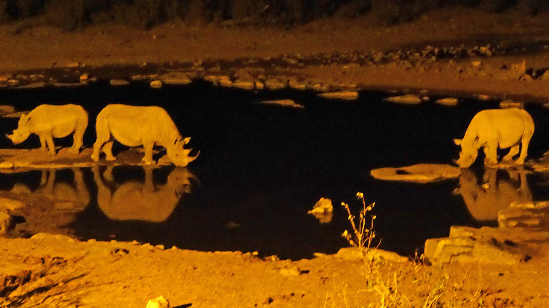 Am auch mit Flutlicht beleuchteten Wasserloch des Camps bestaunte Gerald wie Nashörner ihr Revier und ihre Rangordnung verteidigten.