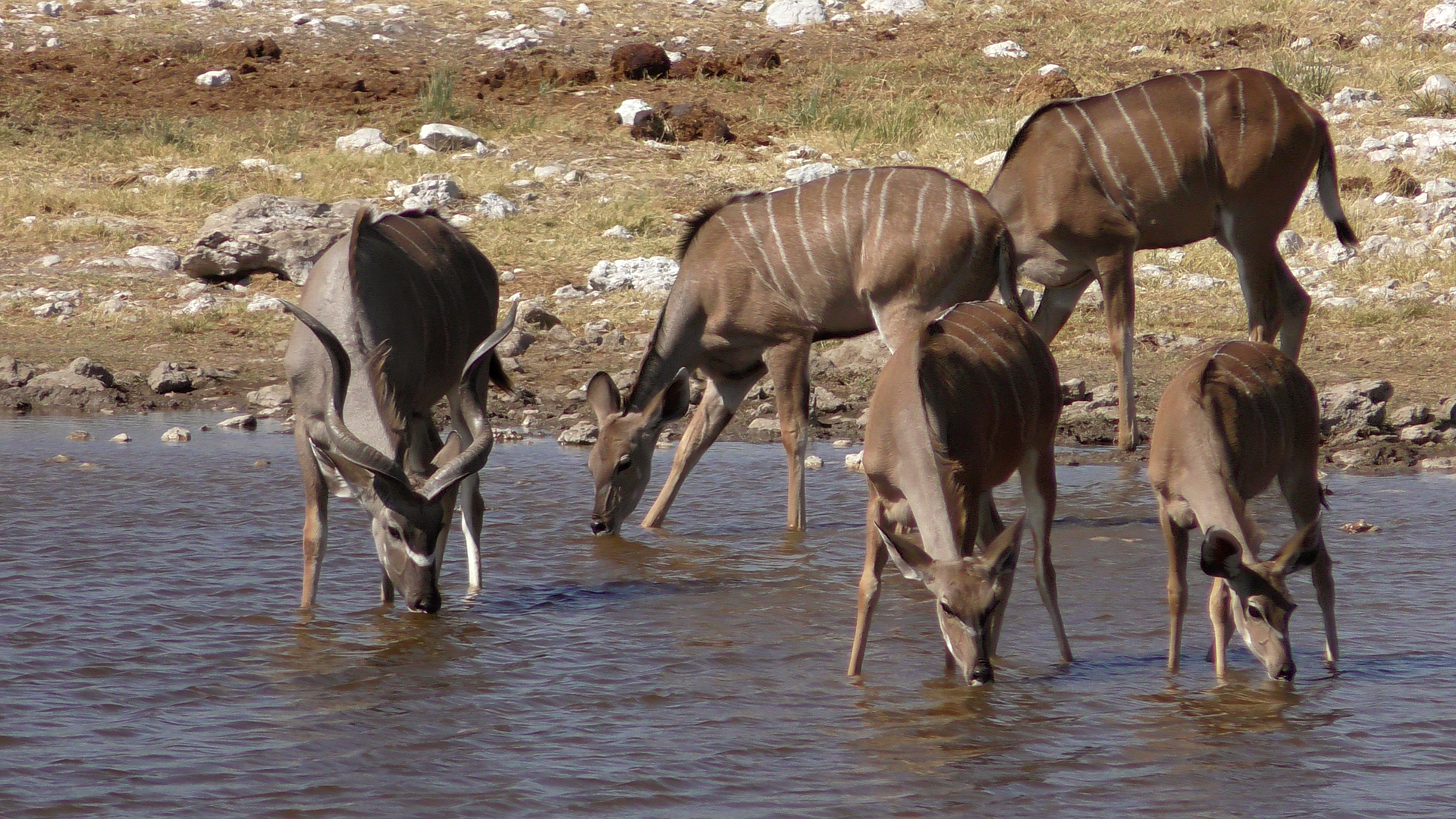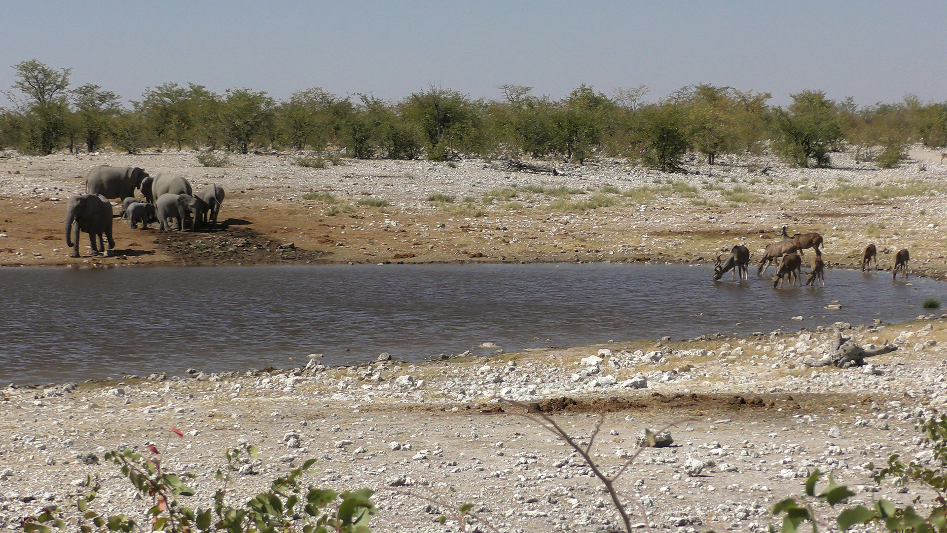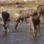 Als wir an dem Wasserloch „Aus“ ankamen, waren zunächst nur Vögel, Springböcke, Oryx und andere kleinere Tiere zu sehen. Doch wenige Minuten später kam eine Elefantenfamilie aus dem Gebüsch und marschierte zum Wasserloch. Eine ganze Stunde konnten wir beobachten, wie die Elefanten tranken, spielten und sich mit Wasser bespritzten. Dann trottelte die Elefantenfamilie wieder hinein in die Büsche und war schnell nicht mehr zu sehen.