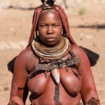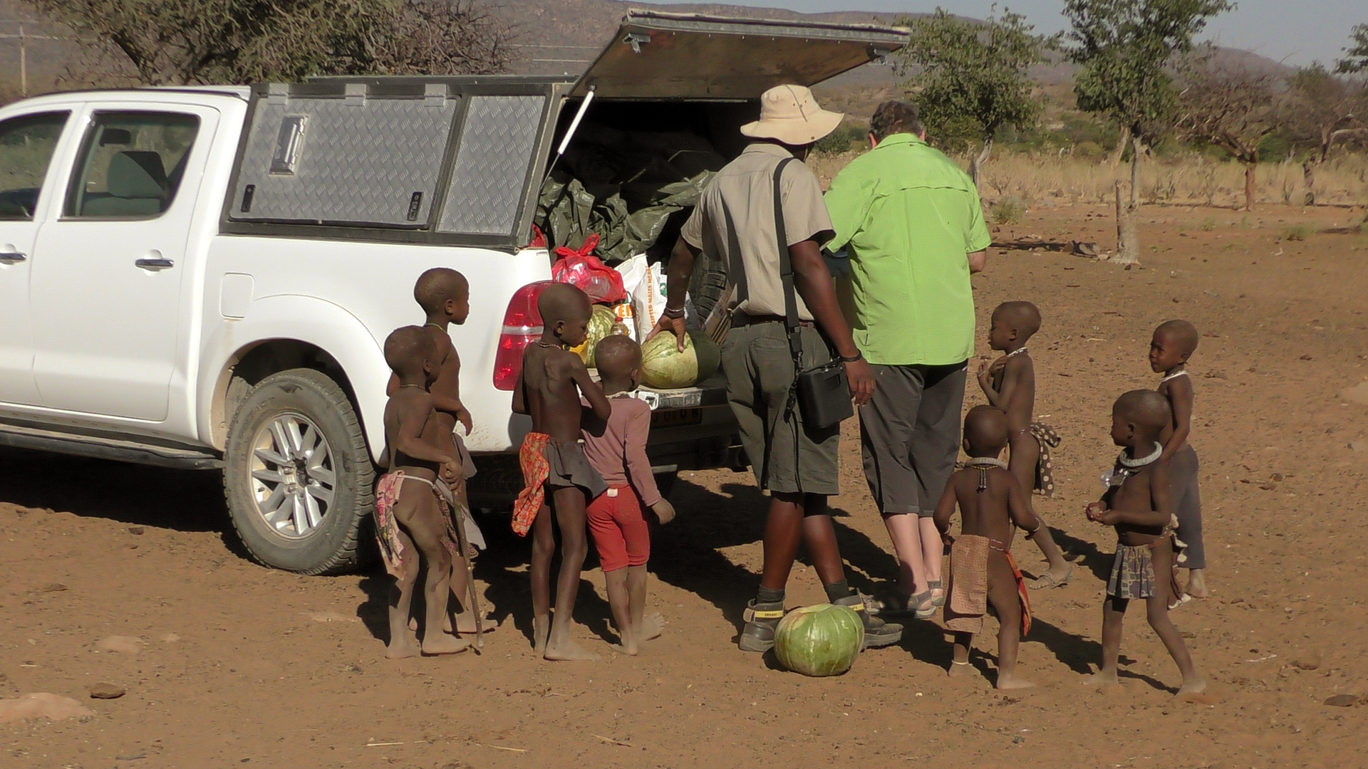 Pünktlich um sieben Uhr trafen wir uns mit unserem Guide John an der Kreuzung im Tal und fuhren mit ihm zum ersten Himba-Kral. John ging erst einmal in den Kral und fragte, ob wir willkommen wären. Wenig später kam John zurück und sagte uns, dass wir eingeladen sind. Wir nahmen unsere Einkäufe vom Vortag mit freuten uns, in lauter lachende Gesichter zu blicken. Bei den Himbas waschen sich die Frauen im ganzen Leben nicht, sie schmieren sich nur mit roter Erde als Schutz gegen die Sonne ein. Auch verhüllen die Frauen ihre Oberkörper nicht. Die Männer waschen sich und tragen auch T-Shirts. Bei den Himbas können die Männer bis zu sechs Frauen haben, wobei die erste Frau ihnen von den Eltern eines Kindes im Alter von zwei Jahren zugeteilt wird. Die Frauen leben in eigenen Hütten, der Mann wechselt alle zwei Tage die Hütte um allen Frauen gerecht zu werden. Ist der Mann bei einer anderen Frau, kann ein anderer Mann bei der Frau verbringen, die in dieser Nacht keinen Mann hat.